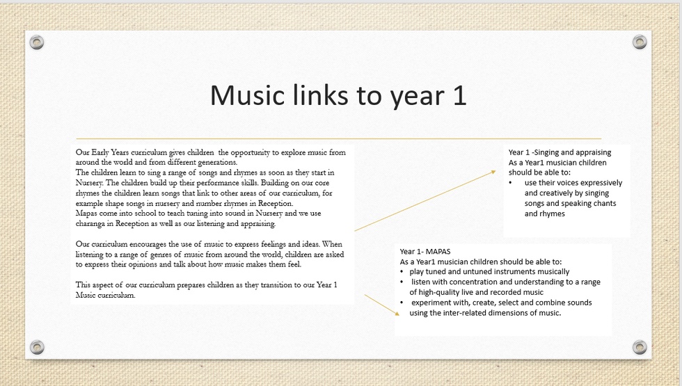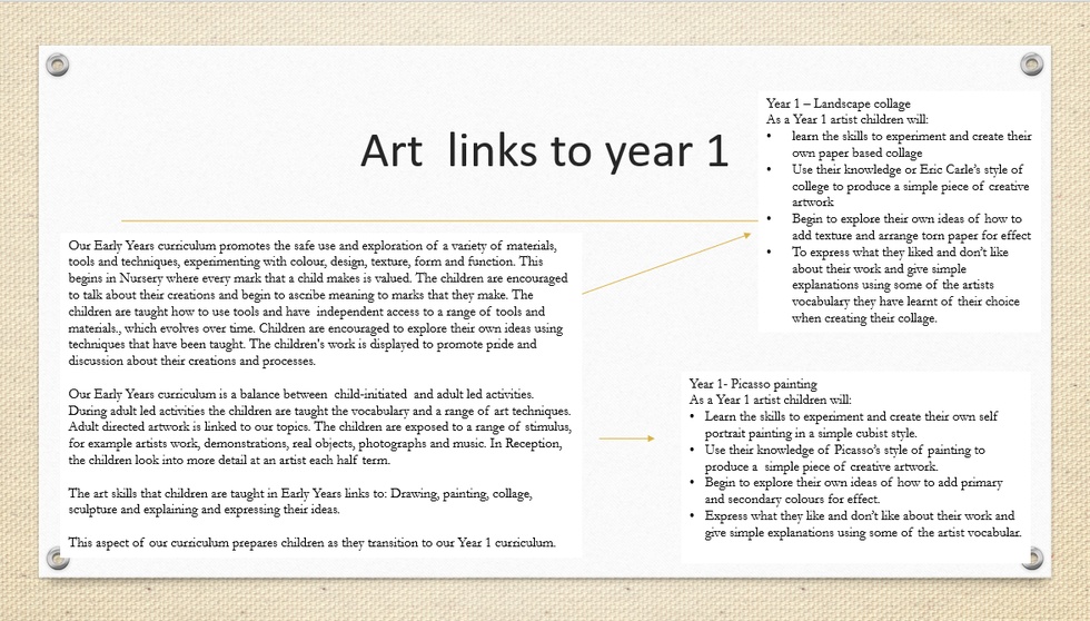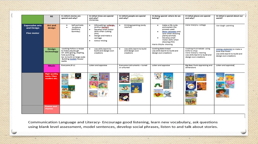 The development of children's artistic and cultural awareness supports their imagination and creativity. It is important that children have regular opportunities to engage with the arts, enabling them to explore and play with a wide range of media and materials. The quality and variety of what children see, hear and participate in is crucial for developing their understanding self-expression, vocabulary and ability to communicate through the arts. The frequency, repetition and depth of their experiences are fundamental to their progress in interpreting and appreciating what they hear, respond to and observe.