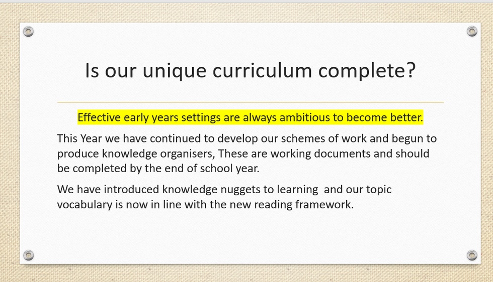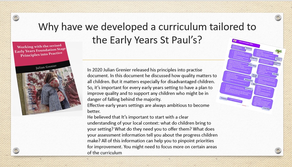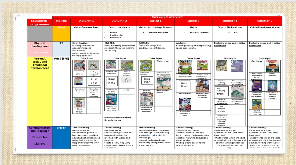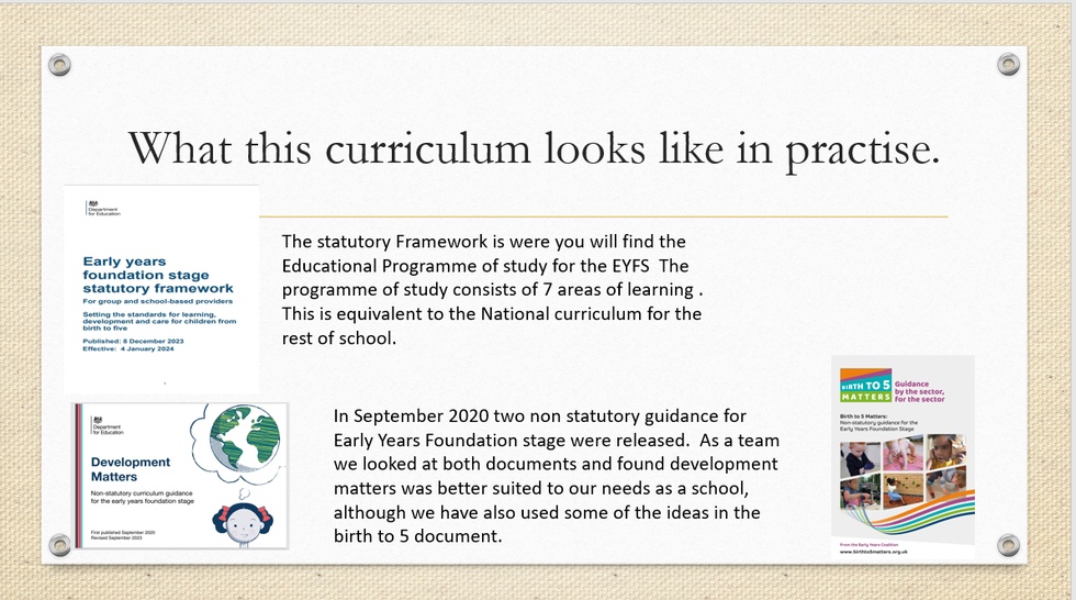 The development of children's spoken language underpins all seven areas of learning and development. Children's back-and -forth interactions from an early age form the foundations for language and cognitive development. The number and quality of the conversations they have with adults and peers throughout the day in a language rich environment is crucial. By commenting on what children are interested in doing, and echoing back what they say with new vocabulary added, practitioners will build children's language effectively. Reading frequently to children, and engaging them actively in stories, non-fiction, rhymes and poems, and they then providing them with extensive opportunities to use and embed new words in a range of contexts, will give children the opportunity to thrive. Through conversation, story-telling and role play, where children share their ideas with support and modelling from their their teacher, and sensitive questioning that invites them to elaborate, children become comfortable using a rich range of vocabulary and language structures.