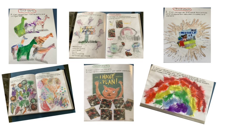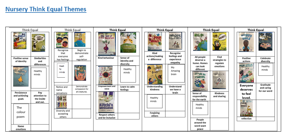 We use Think Equal to support our PHSE development. This is a global social and emotional learning (SEL) programme which offers a foundation in social justice and mental health between the ages of three and six in order to ensure increased positive life outcomes. The programme is fully aligned with the EYFS curriculum and teaches 25 skills and competencies to help children through their Early Childhood Education. These skills lay the prosocial foundations within the developing brain which leads to successful futures, both for the individual child and wider community.  Children learn, for example, to: