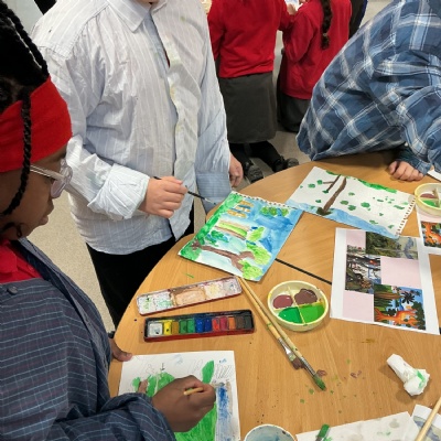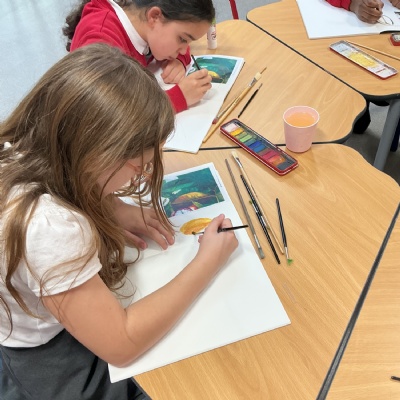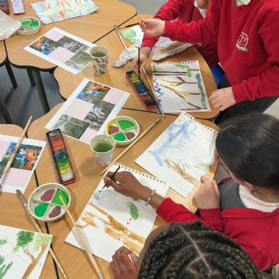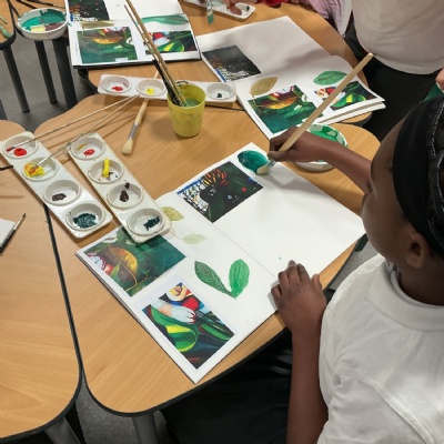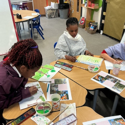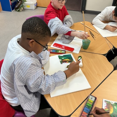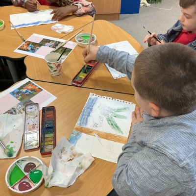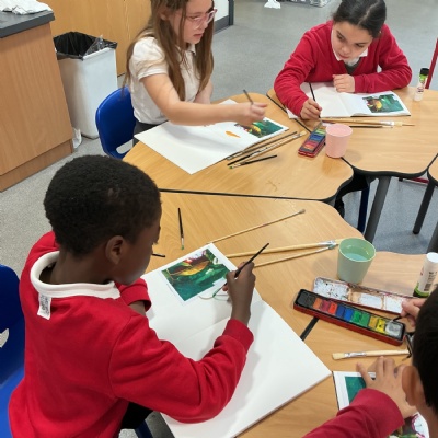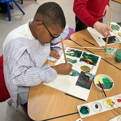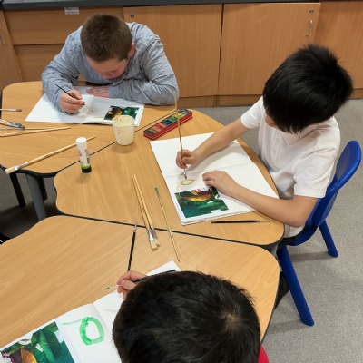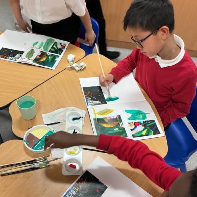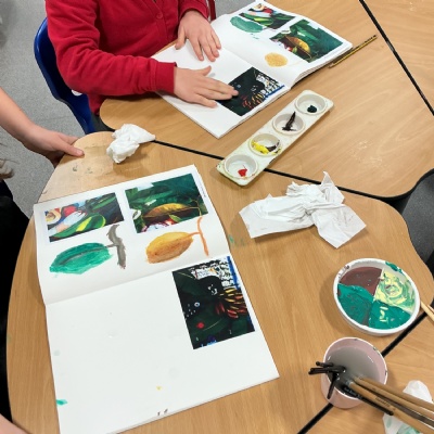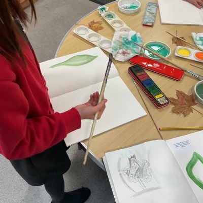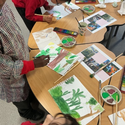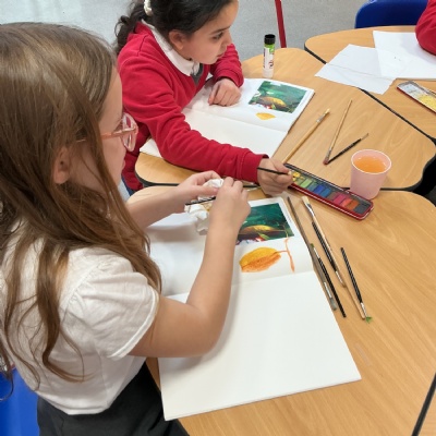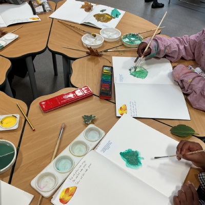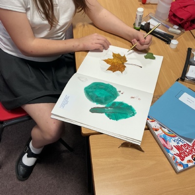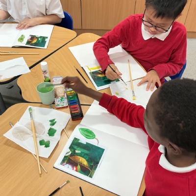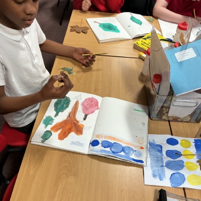 This week, Year 5 has been learning about different painting techniques. They used various brushes and paints to create their own pictures of leaves.
