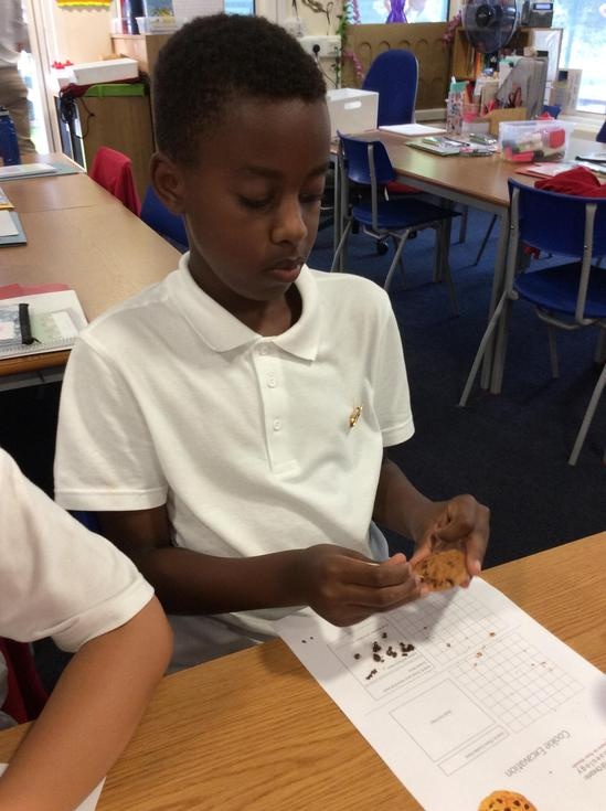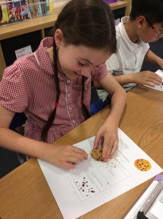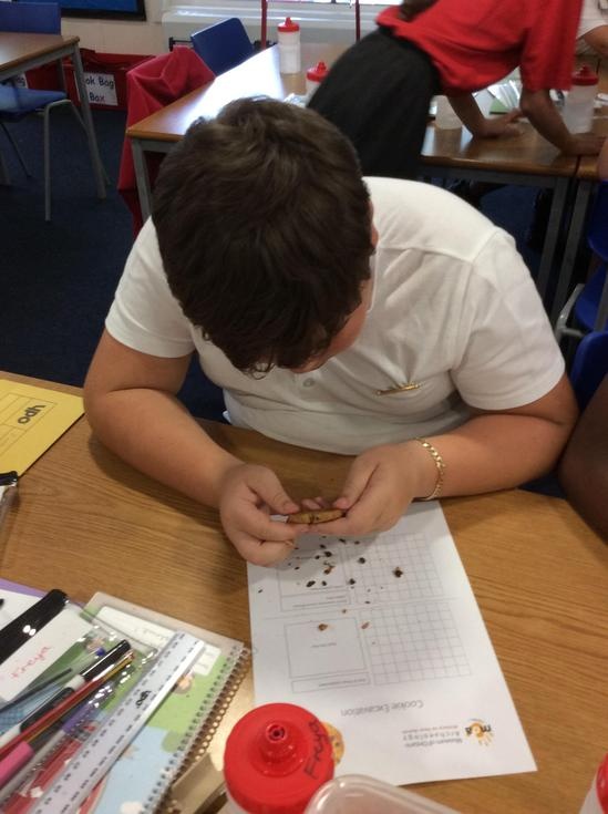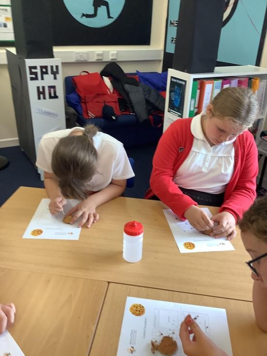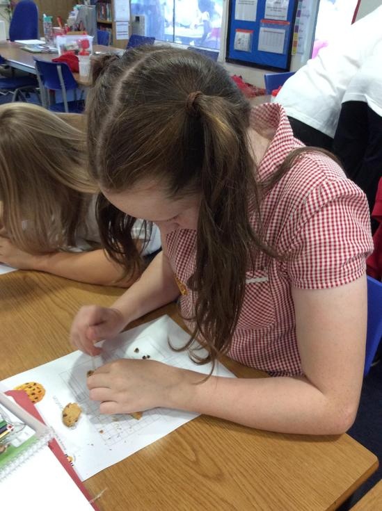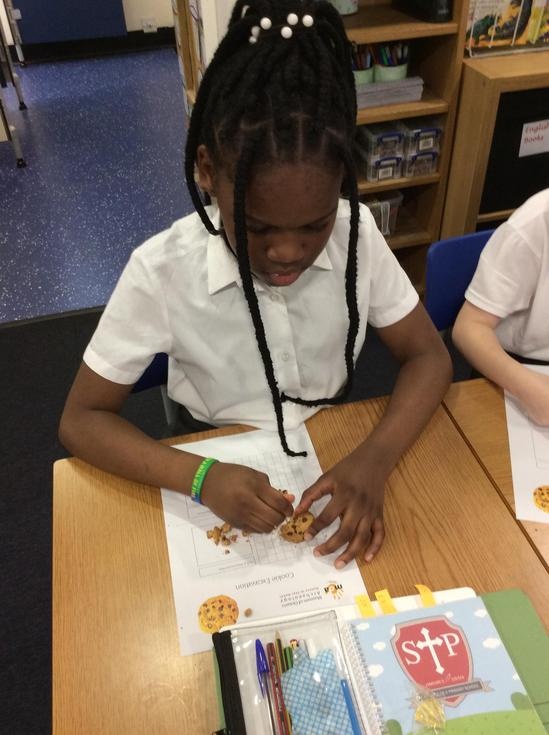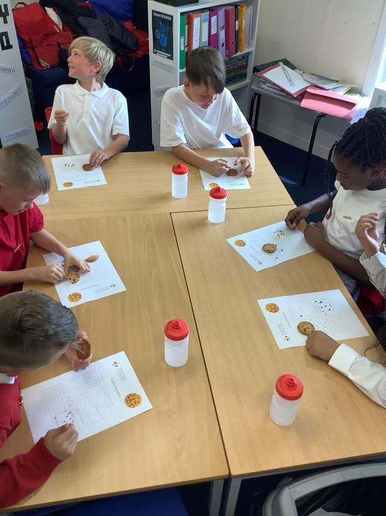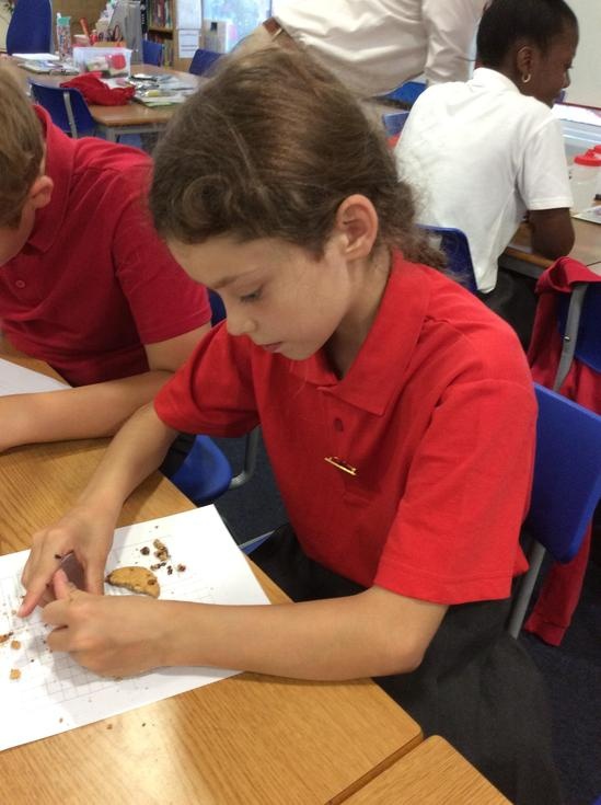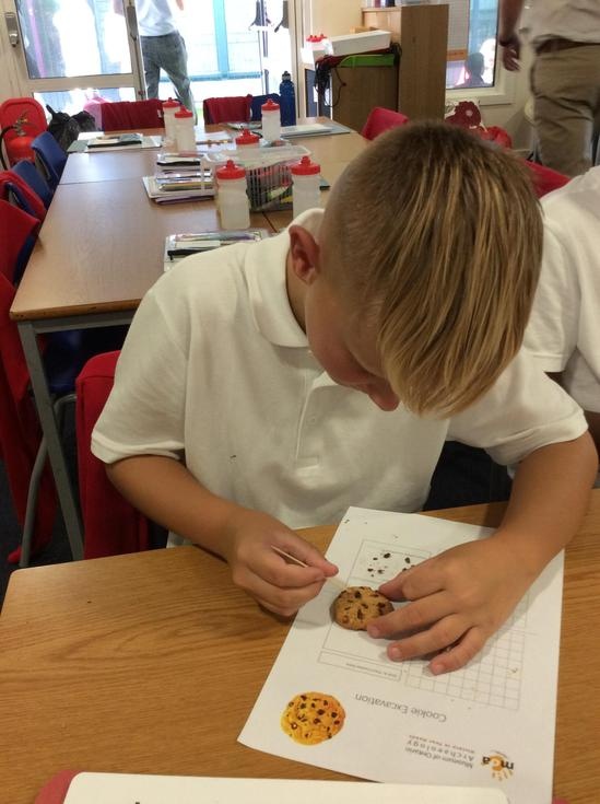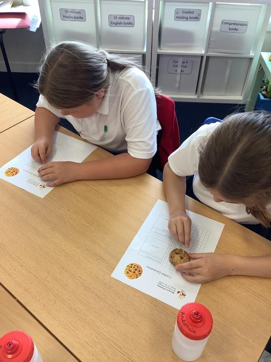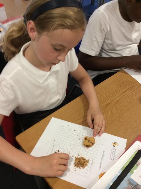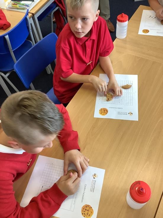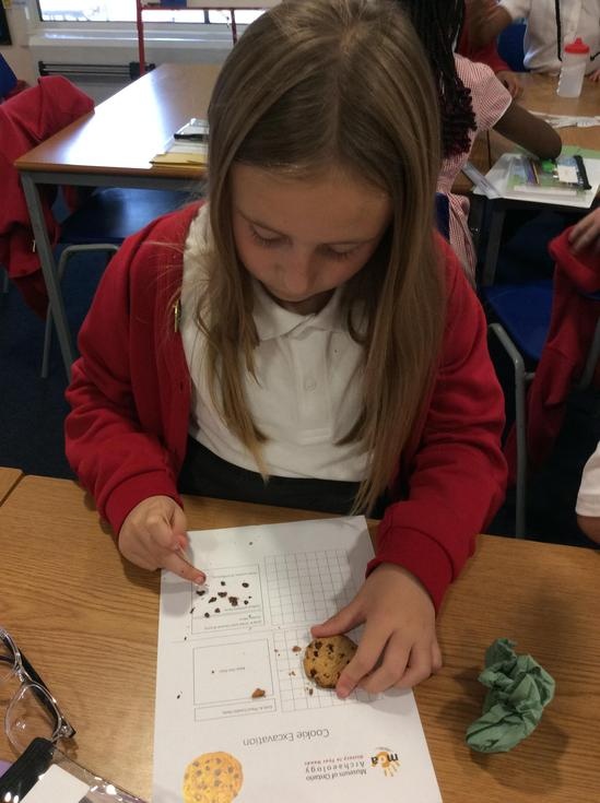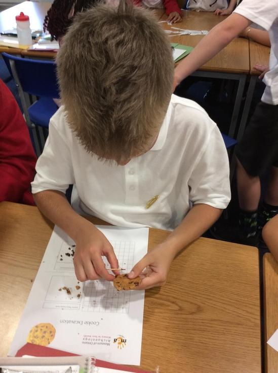 We practiced our paleontology skills by excavating choc chip cookies (stone) with cocktail sticks as a hammer, to uncover the choc chips (fossils).